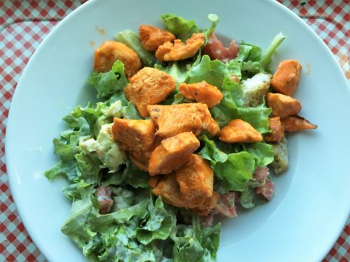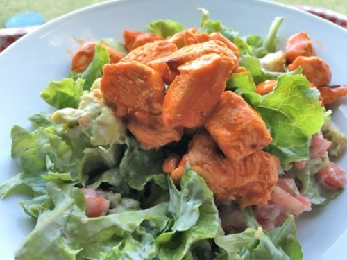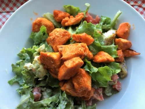 - Combine lettuce with fresh tomato, croutons, green onions, and avocado. Add buffalo chicken and drizzle on Ranch dressing.