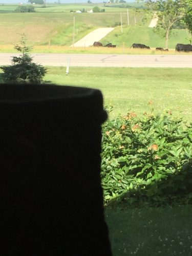 The sun is brightly shining on this cool morning, down on the green grass and the cornfield just across the way. It shines down on the backs of our Black Angus cattle, making their hides shine like they’re been rained on. The pond glistens with the morning sun.