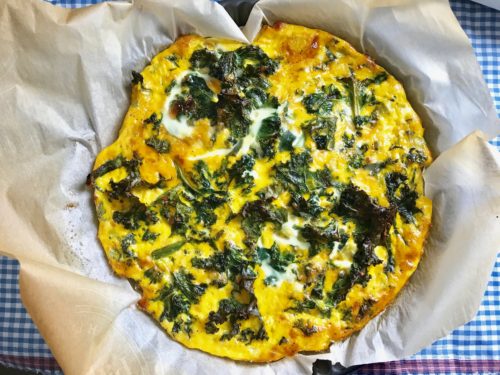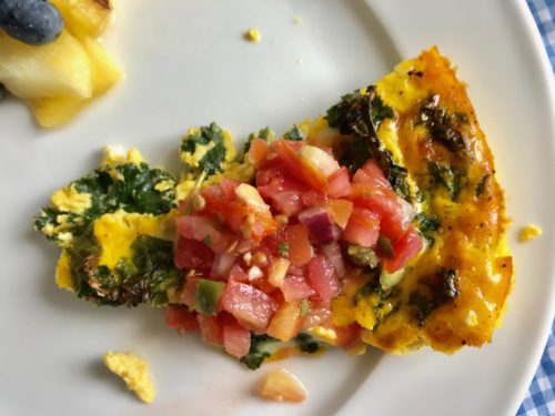 Well, you don’t have to be as rigid with this wonderful crustless quiche. One will definitely need eggs, milk, and some cheese, but add or subtract (as you like) with the vegetables. Yippee! I had plenty of eggs and cheese, but only a few sparse veggies remained in the fridge to whip up a healthy egg bake. Like a handful of kale and some almost ready to pitch green onions. Voila! Add them to the quiche and a healthy, delicious, breakfast is ready!