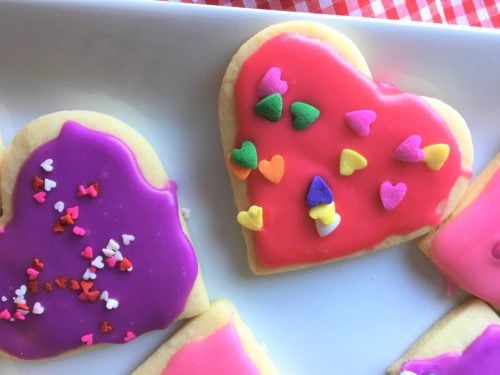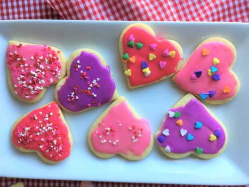So that’s just what we did – I worked on cutting out the cookies, and making the icing for the sugar cookie hearts. She whipped up thirty-seven chocolate dipped pretzels (to be exact), and I let her take care of about all of the sprinkles (as maybe you can tell). It was teamwork. We’ve had fun enjoying them as an after school snack and giving some away, too. I may need to even make a few more – they’re going fast!