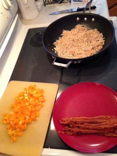 - Fry the bacon in the microwave on paper-towel covered plate for 5 minutes. Chop into bite-size pieces.