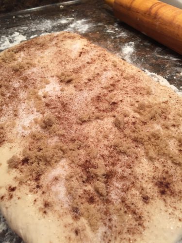- Roll out dough 8"x12" (approx). Spread butter on dough, then sugar, and finish with cinnamon. Roll up and seal the edge. Slice into 1" pieces (approx) and place in pan filled with pecan mixture.
