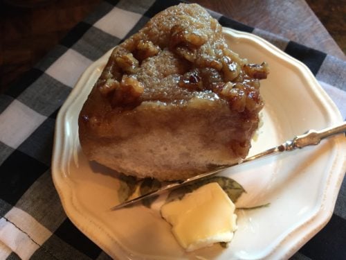 - Melt butter in a 8x8 or round cake pan; stir in brown sugar and corn syrup until all is mixed together. Pour pecans onto the bottom before adding the rolls.The homemade white bread recipe makes 4 pans of rolls. For each pan: