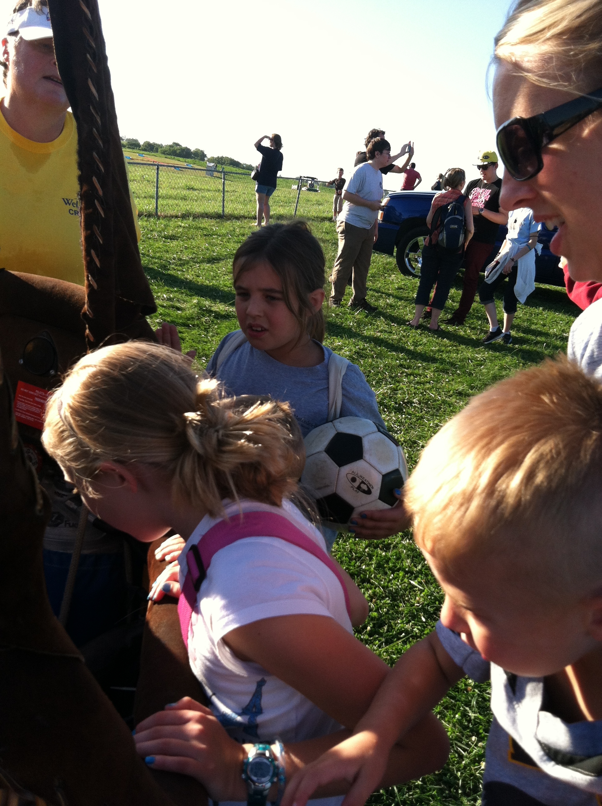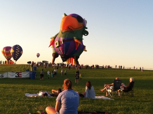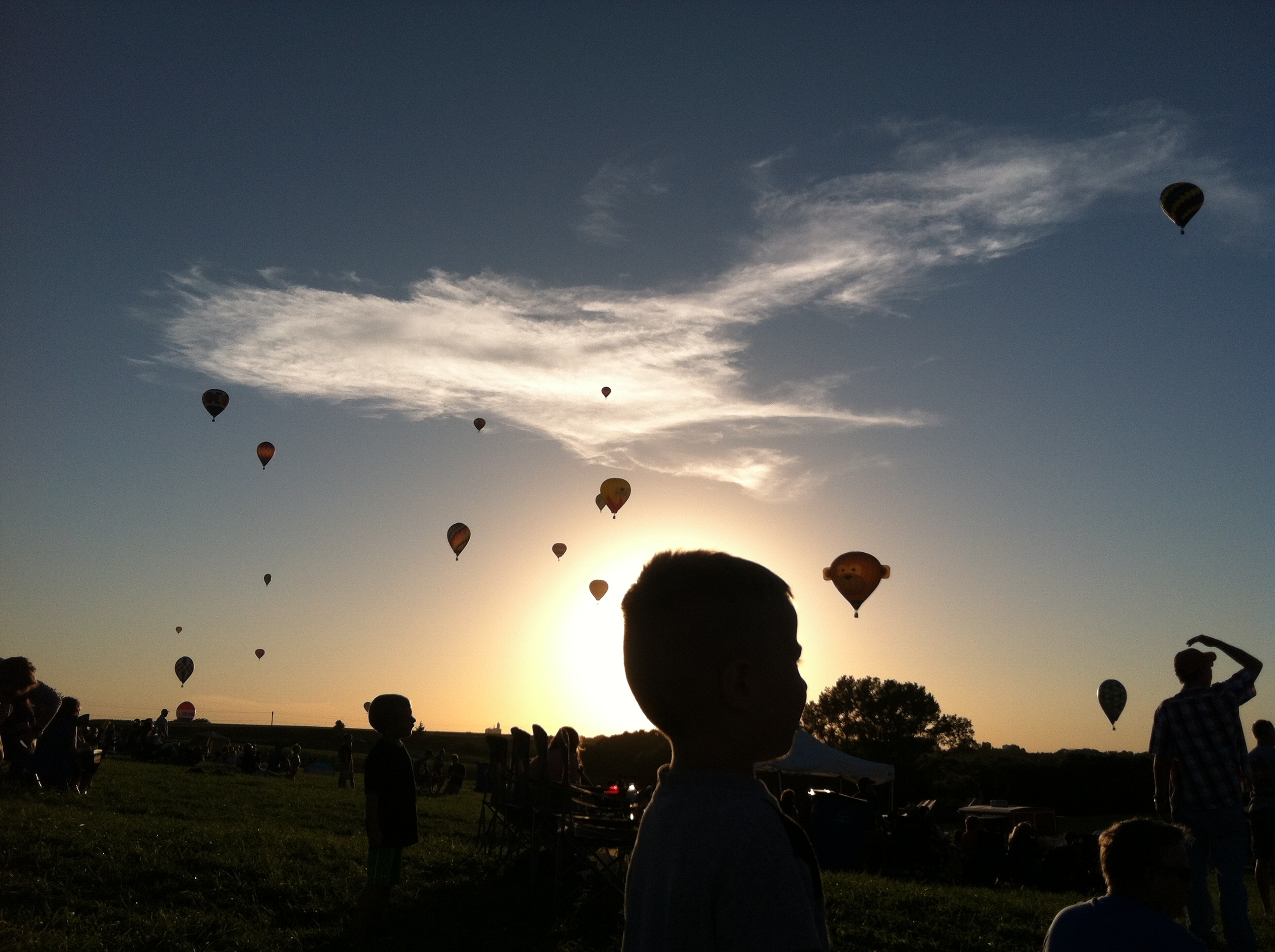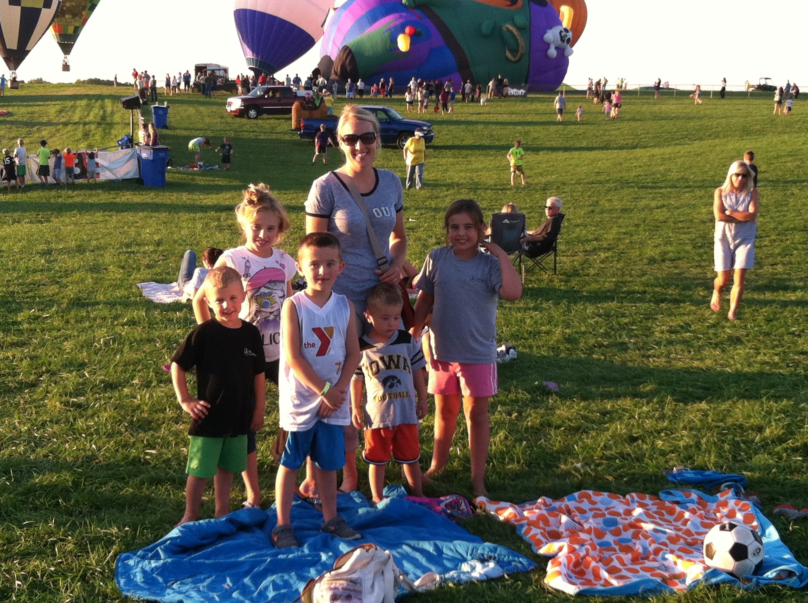 The National Hot Air Balloon Festival was the happening event in Iowa a few days ago…….and I was subconsciously paying attention to the dates, times and wind. Why? Number 1 reason: Little Matthew is FASCINATED by balloons and I wanted to see his excitement, along with his siblings, on this calm summer evening. Mr. Farmer was working and Matthew’s daddy was working, so I headed to Annie’s, had a quick bite to eat, and the 7 of us loaded up, put on our bug spray and sunscreen and headed south to Indianola. Seems everyone else thought it was a perfect night, as well. The traffic moved slowly for a few miles, but we managed to make to our destination before the start time.