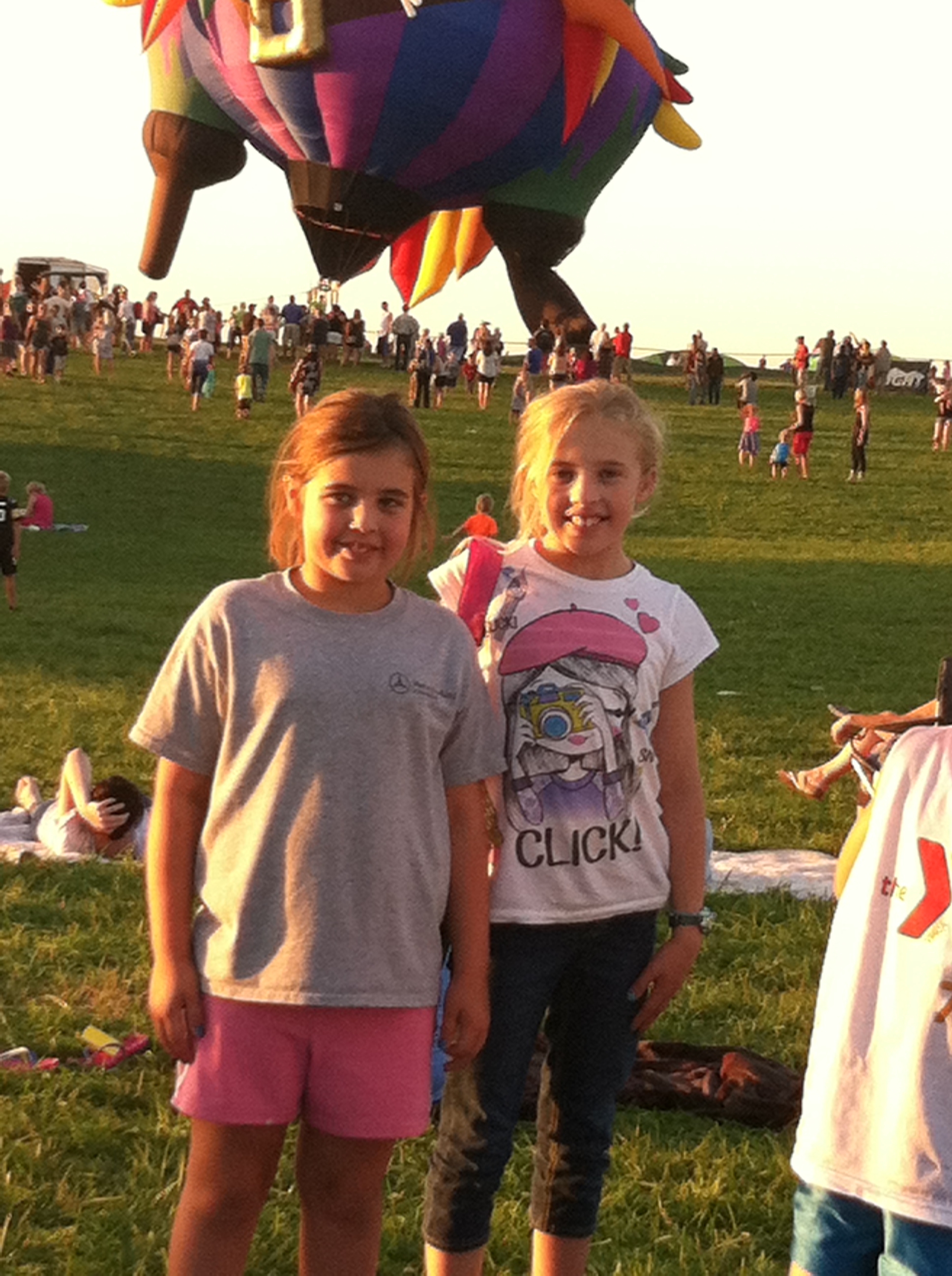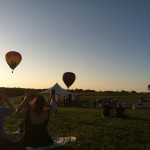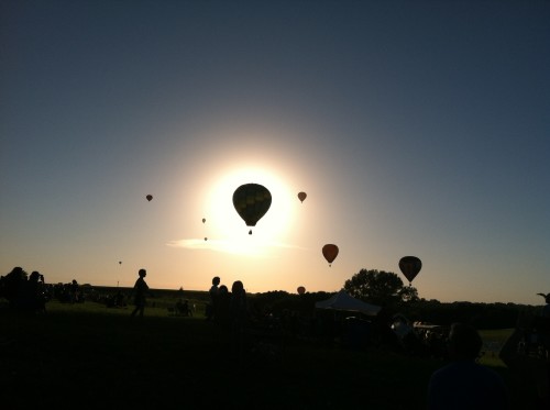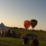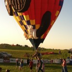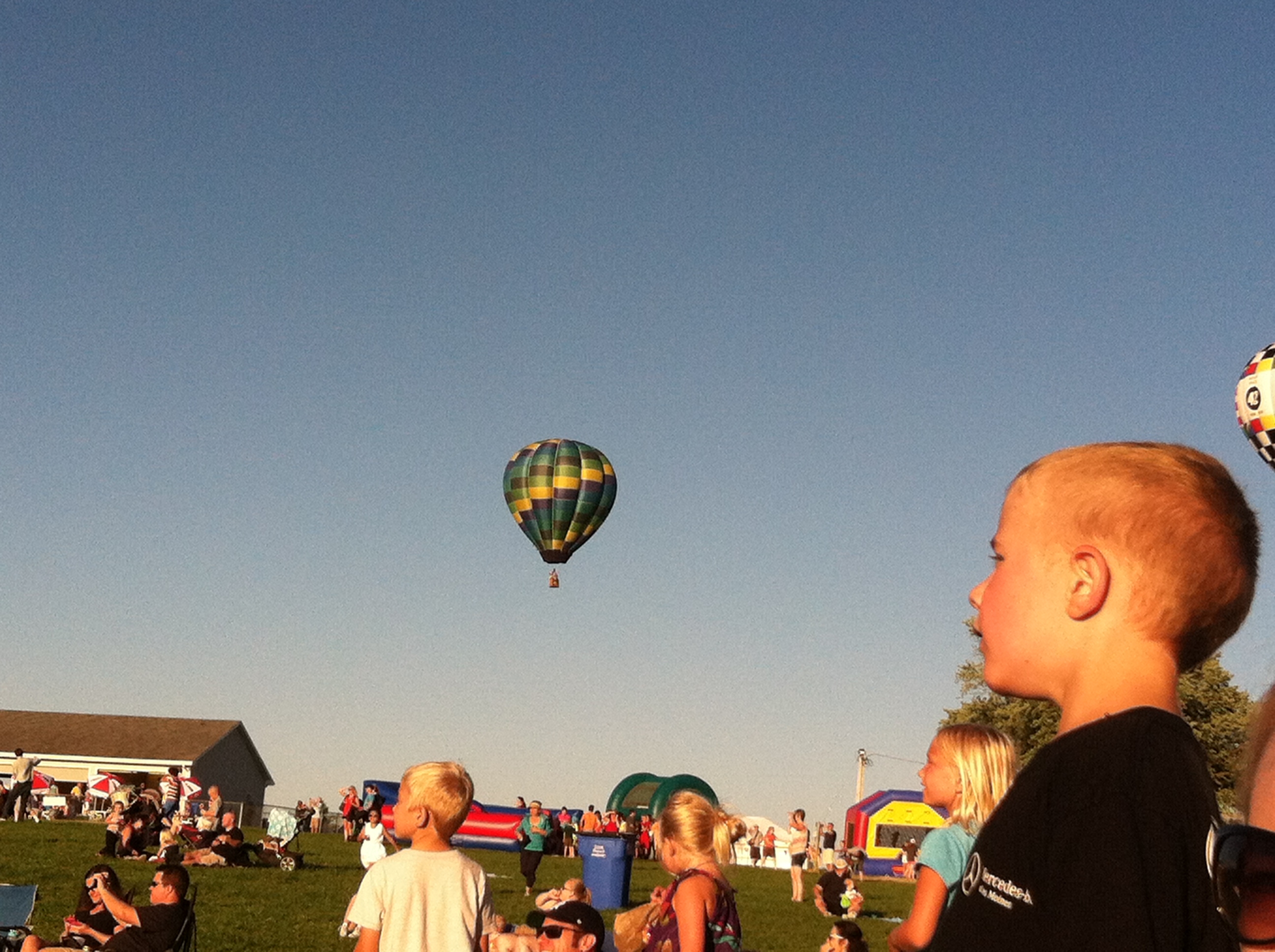 The balloon pilots were involved in a competition. There was a mowed circle of ground to the north of the spectators. In the circle there was a quadrant made with 4 baby swimming pools in each section. The pilot’s objective was to fly over the circle and throw a waited garbage bag into one of the pools. The pilot first had to maneuver the balloon over the circled area, which, of course, was the hardest task of all. Many balloons came close, only a few hovered over the site……for a moment. Many bags were thrown down, and I believe only one made it into a kiddie pool. The audience thoroughly enjoyed the competition, with much hooping and hollering going on all around us., seated on lawn chairs, blankets. The children were, of course, having a blast running around on the grassy hillside, pulling on Dad’s shorts leg to plead for sno-cones and cotton candy. Yes, the carnival scene was directly behind us, enticing the children with food, games and neon necklaces.. (Our children were promised ice cream for the trip home.) 🙂