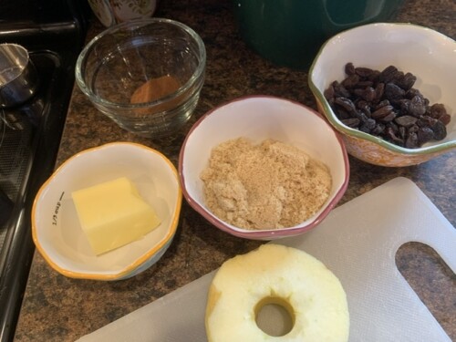 So, what is the meaning of duff? This duff? It means ” a boiled or steamed pudding often containing dried fruit.” Okay, that makes sense since there are raisins stuffed into the apple middles.