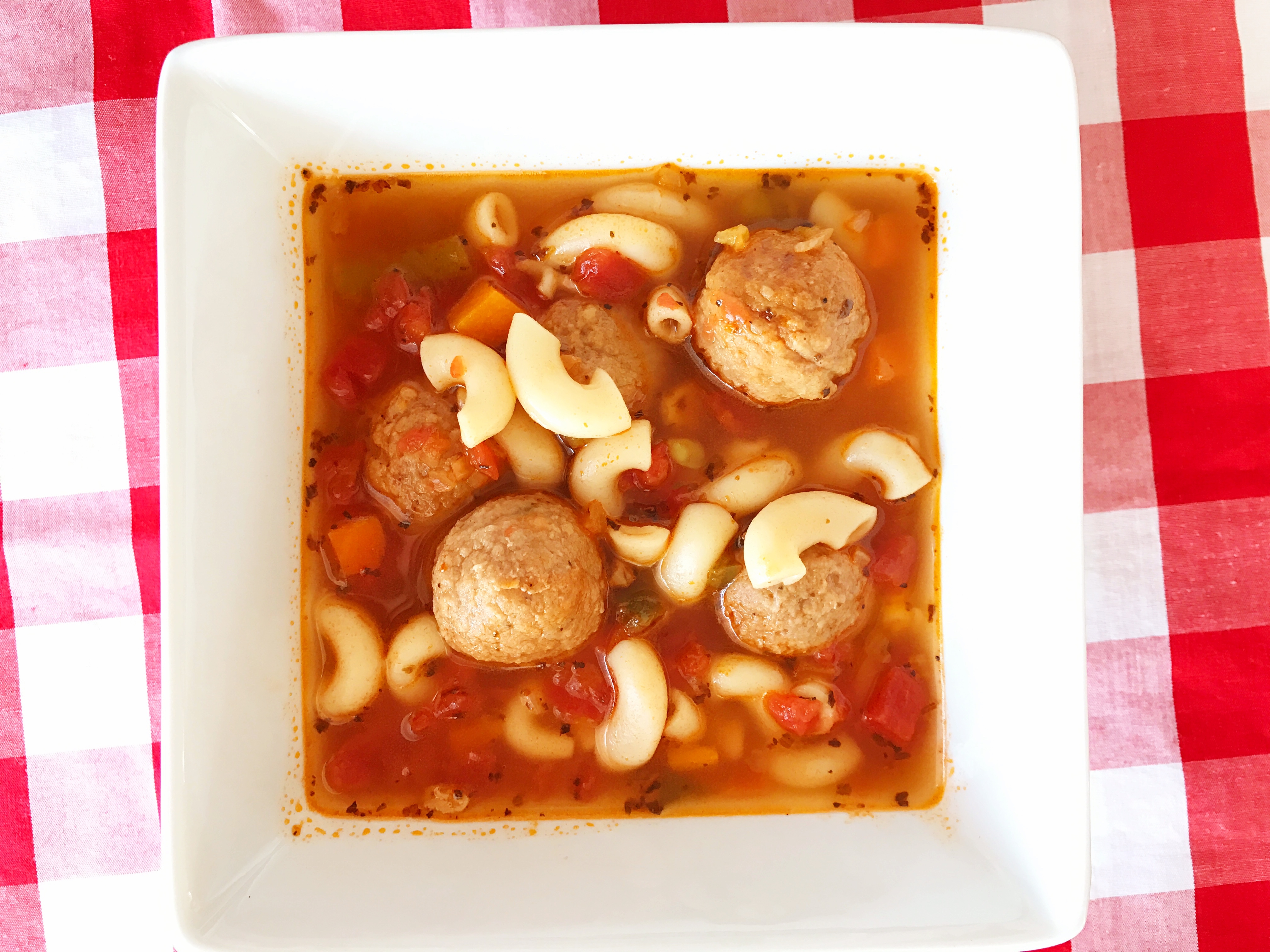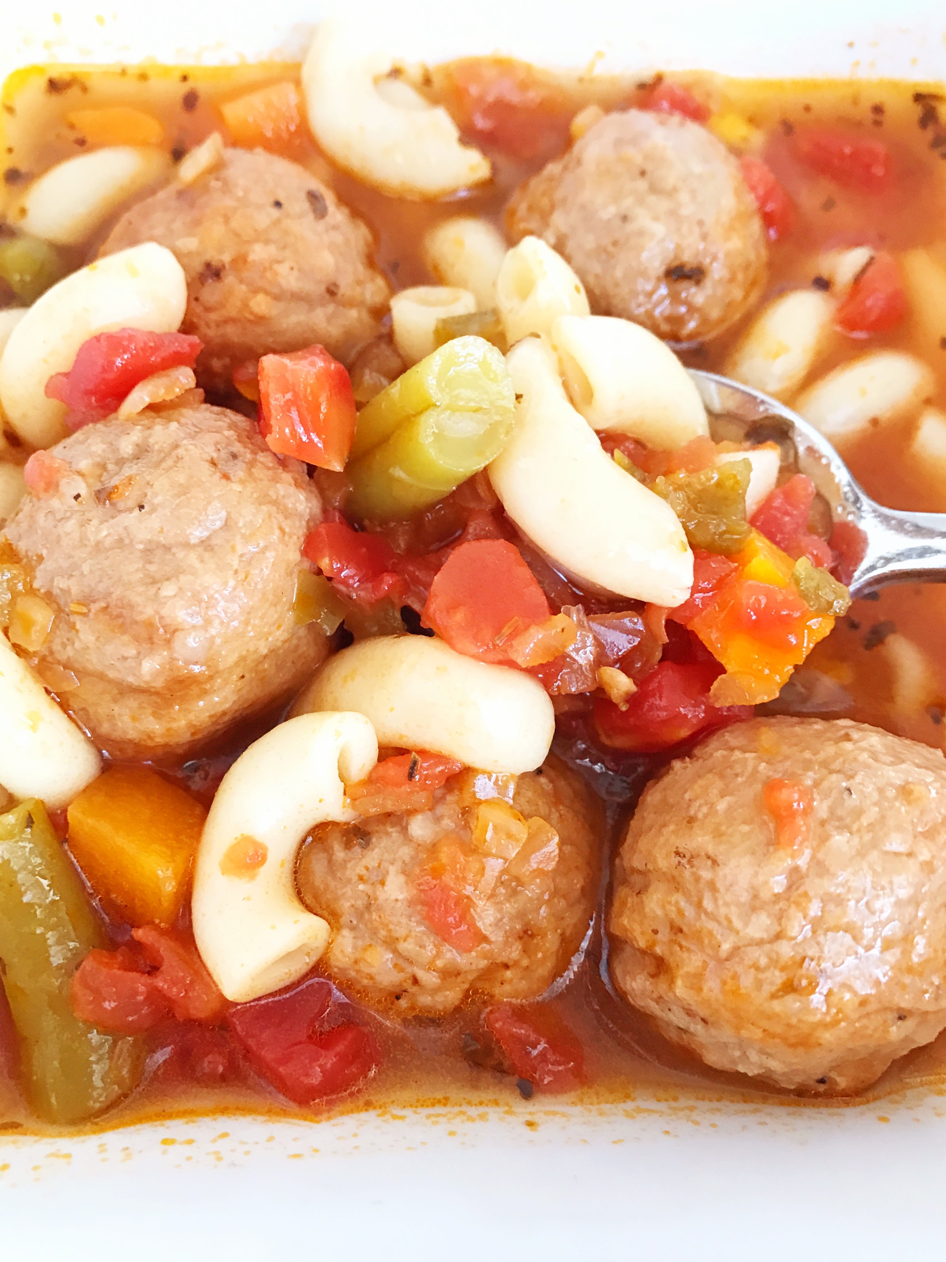 Sometimes you just want a warm and comforting bowl of soup but don’t want to have to put a lot of work into it…insert this Italian Meatball Soup. It’s similar to a minestrone soup but tweaked just a bit to make it a simple, yet filling. This soup has a broth base with added tomatoes, pasta, veggies and meatballs. The Italian tomatoes and Italian seasonings give it just the right Italian flare.