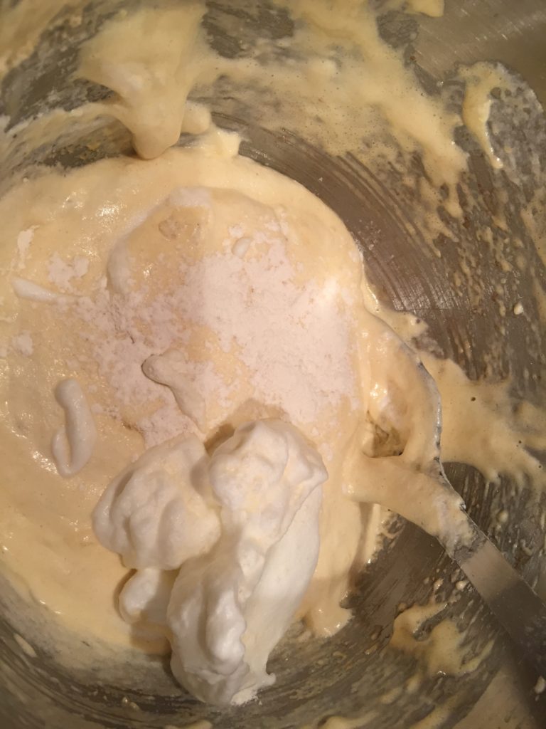 - Beat egg whites and salt together in a separate bowl until soft peaks are formed; sprinkle on sugar and beat until stiff peaks form. Scoop ¼ of the egg whites over the top of egg yolk mixture. ; sift on ¼ of the flour, then fold in until partially blended; add part of tepid butter. Continue until all ingredients are delicately folded in. Be careful not to over mix. The volume is important to make a light cake.
