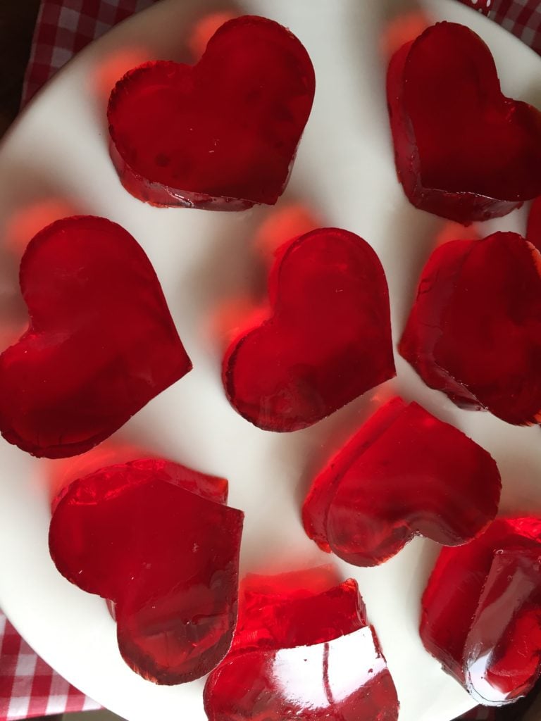Another easily adapted treat is Jello Jigglers. Sugar-free jello is really easy to find and is prepared exactly the same way as the original type. We’ve been having lots of cherry this week to celebrate Valentine’s.