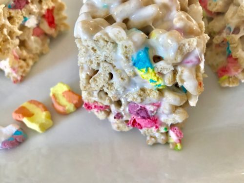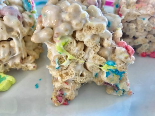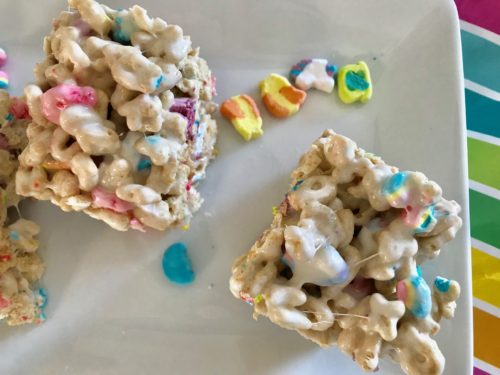 These fun treats seemed just the right snack for us – colorful, easy, and ready for Spring! My kids love to “hunt” for the charms amidst the gooeyness and talk about which one is their favorite and why. Lucky Charms was my top pick as a kid, and admittedly, still is today 😉