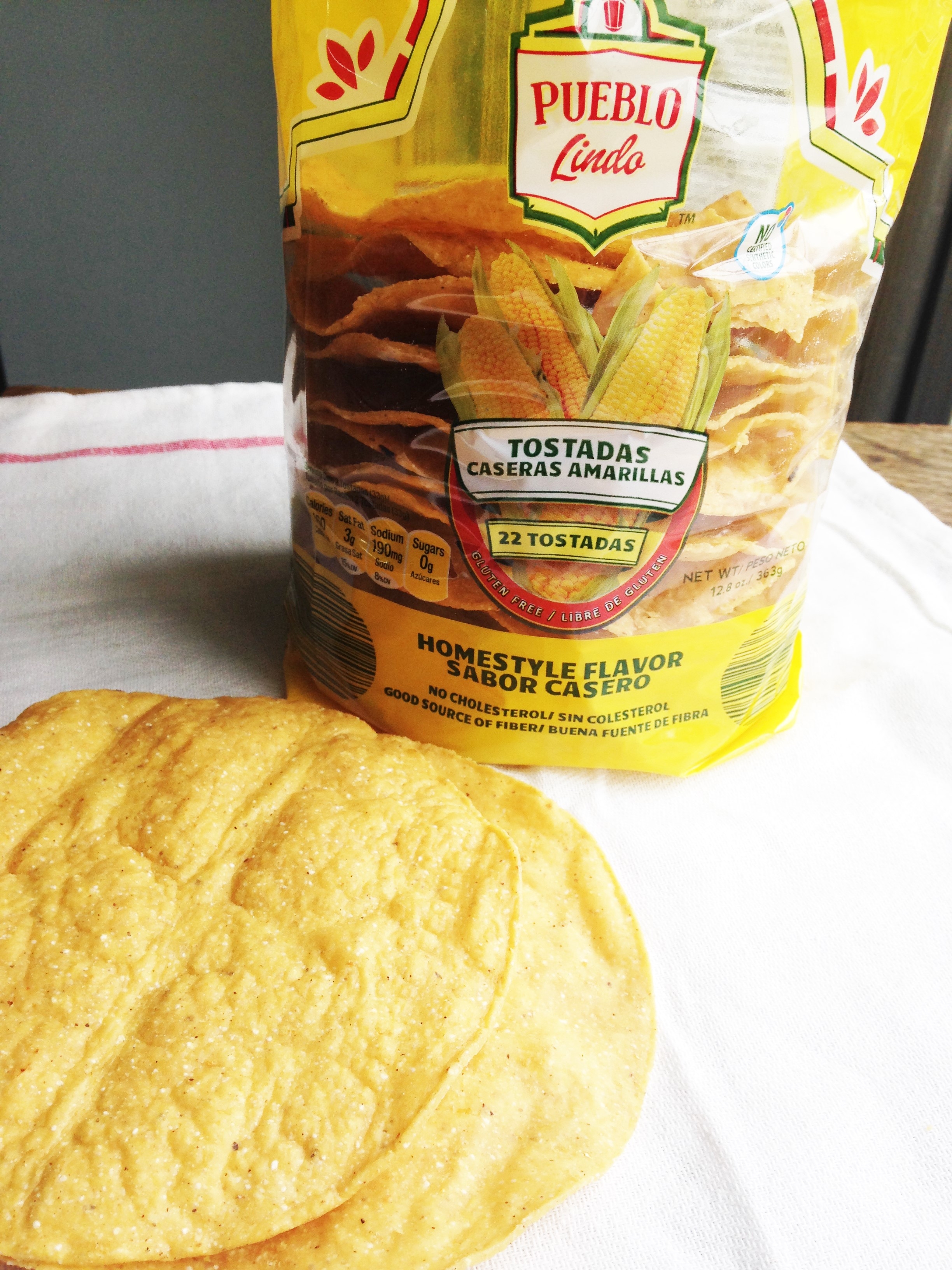 Scrambled eggs are the mainstay ingredient, but the star of the show are the corn tostadas. I love these that I buy at Aldi.