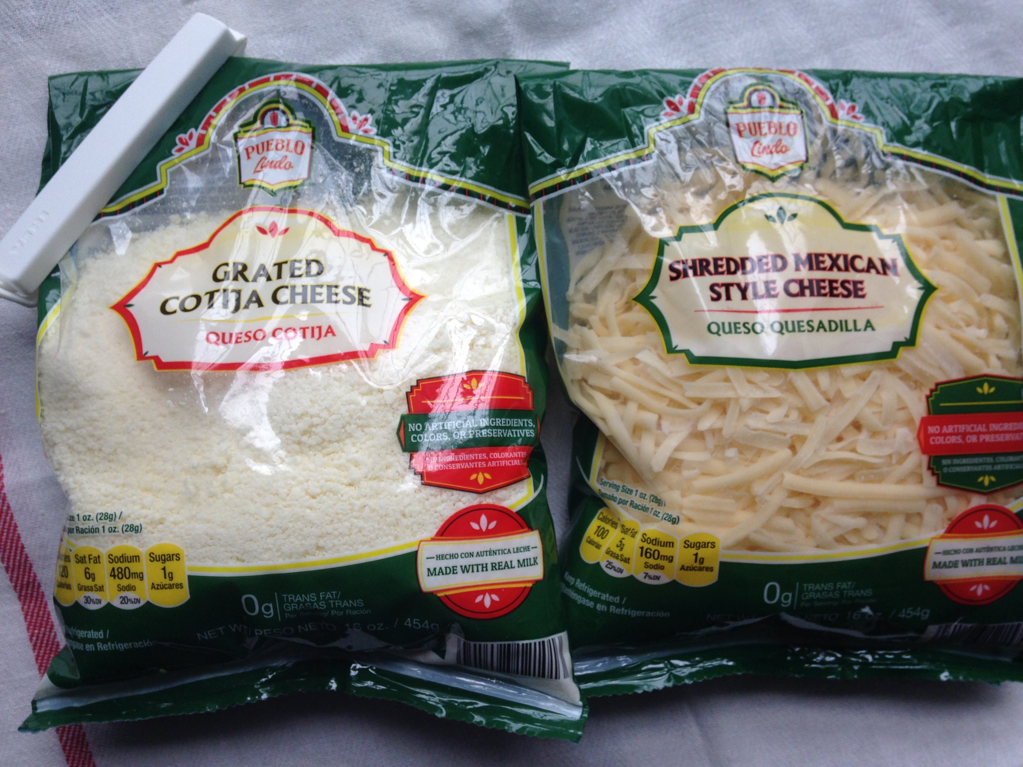 and these delicious Mexican cheeses. (If your grocery store doesn’t carry these, you could use Monterrey Jack and Cheddar).