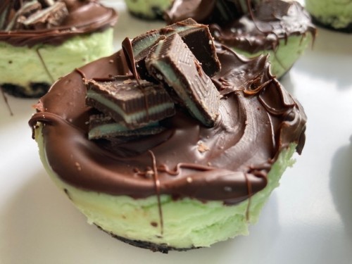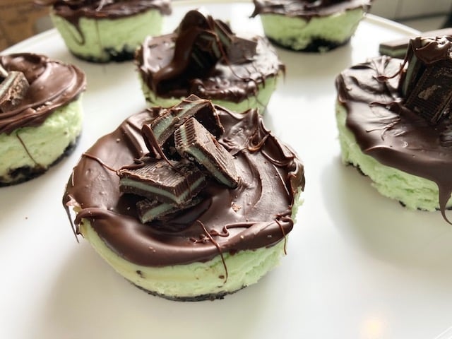 - Melt chocolate chips in microwave according to manufacturers instructions. Top each mini cheesecake with a heaping tablespoon of chocolate and a few pieces of Andes mints.