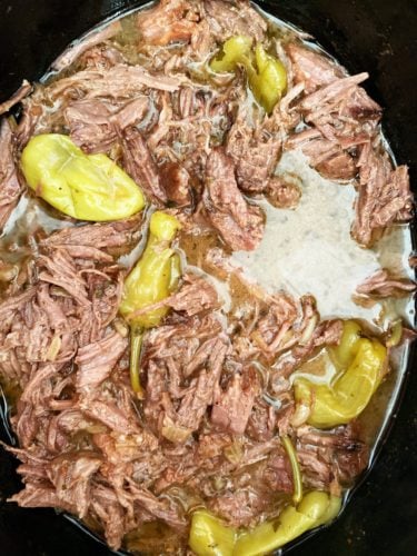 The beef is melt in your mouth tender with an amazing flavor. Top it over mashed potatoes, I like to pull a batch of (Grandma Betty’s make ahead mashed potatoes) to keep the whole meal extra simple. This Mississippi Roast is my go-to comfort food these days. You can also top it over pasta if desired.