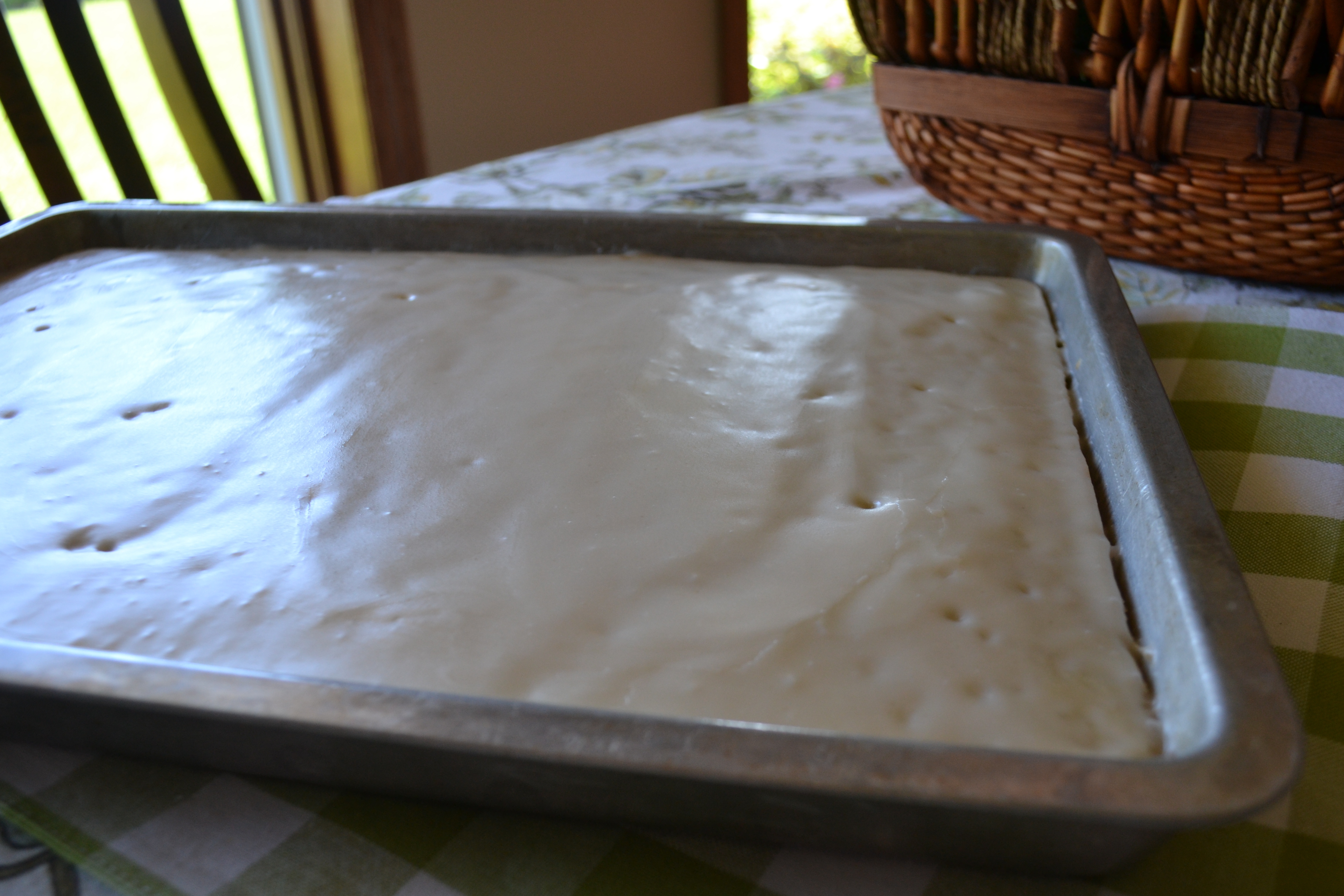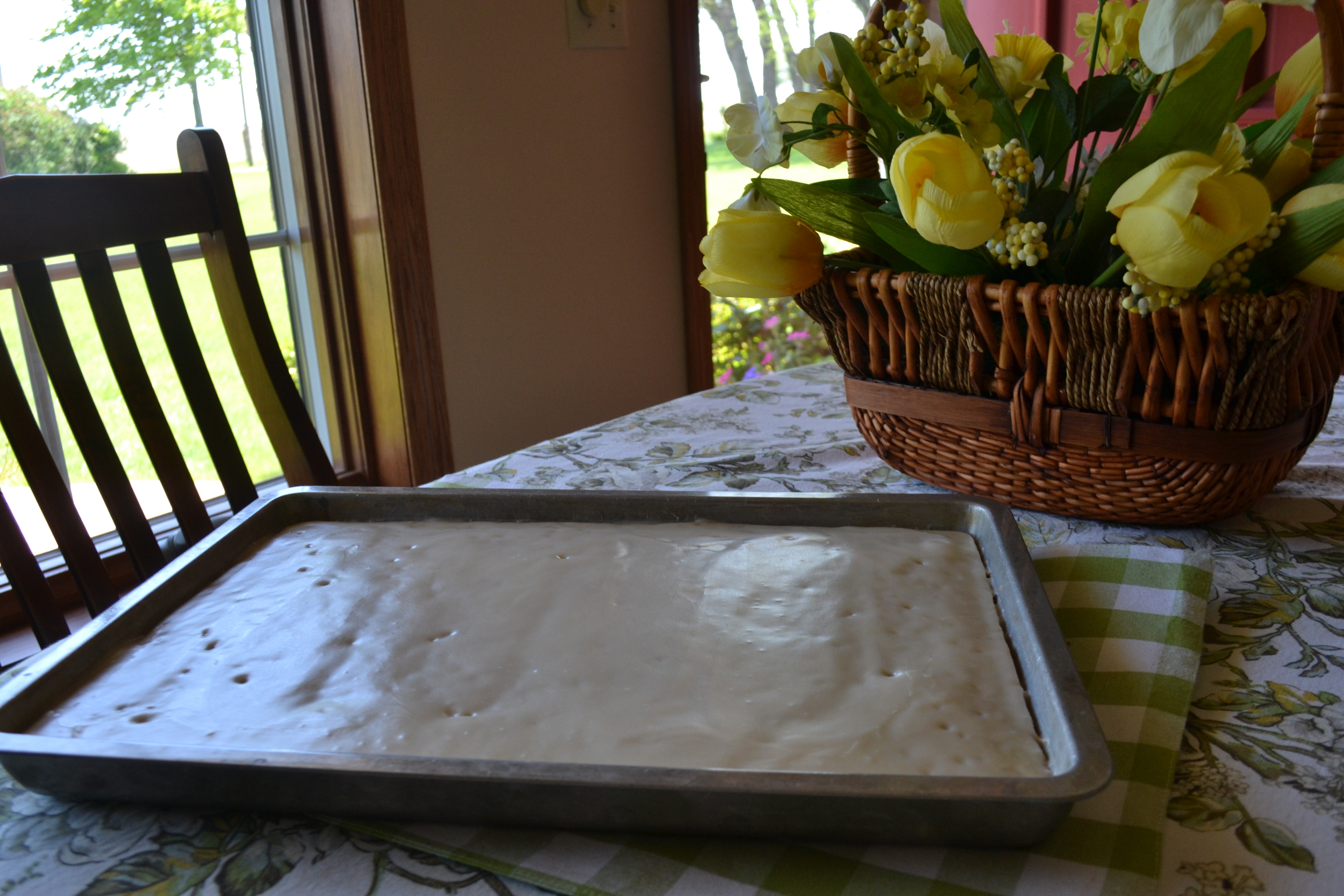 - Mix wet ingredients; add dry ingredients and stir. Pour into greased 17x13 jelly roll pan at bake at 350 degrees for 20-25 minutes.