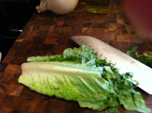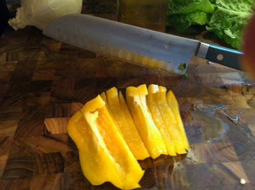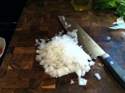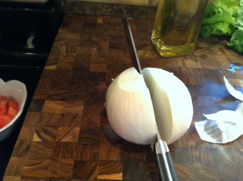 Julia (Childs, that is) taught me how to chop onions: Cut off the top, then the bottom. Peel back the outer layers. Slice 1/2 onion, the chop. Again, this particular knife works wonders.