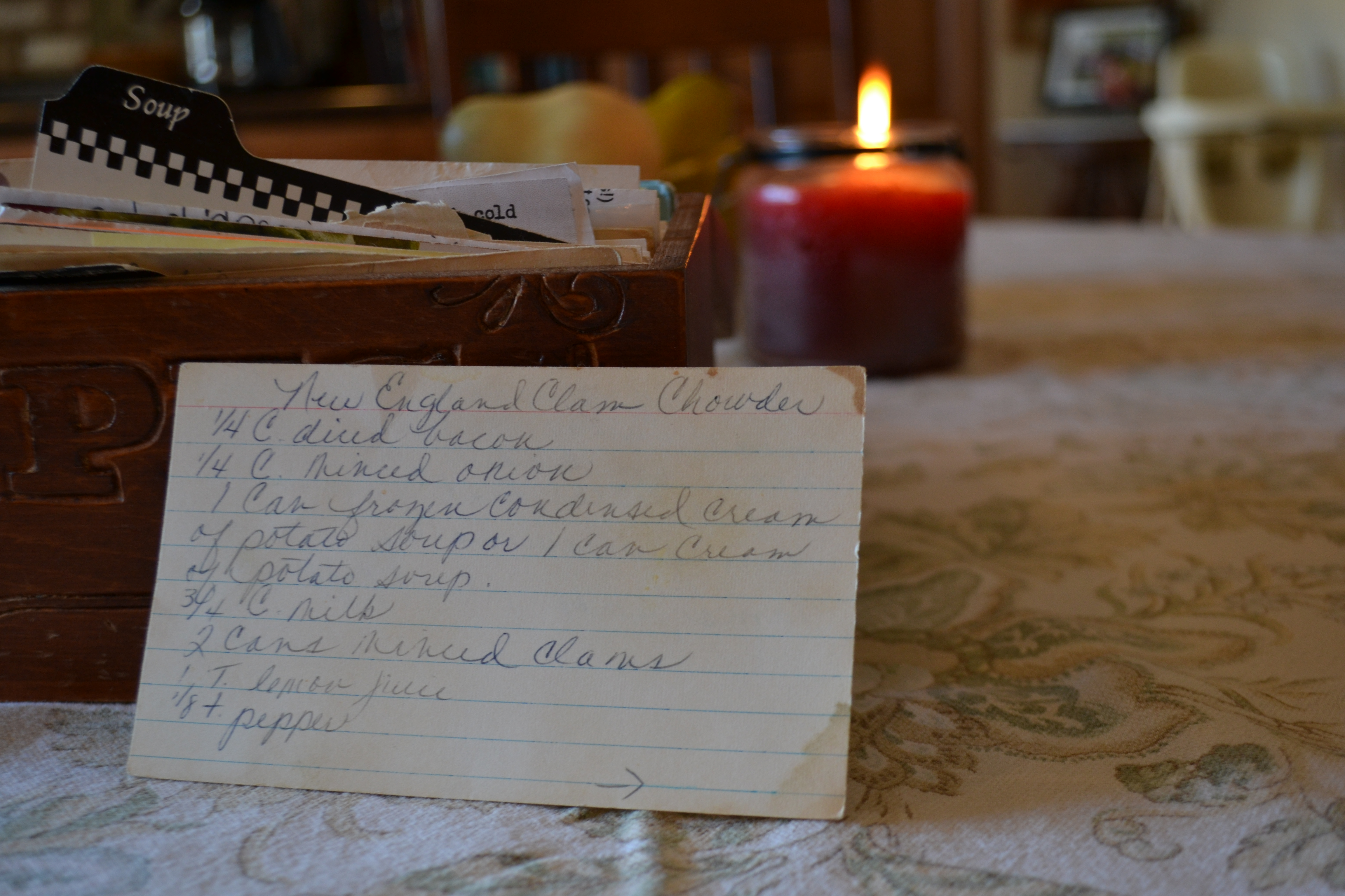 Mr. Farmer really likes this one……and it’s an olllllddddd one. Don’t remember where I got this time-tested favorite, but as you can see, it’s been well-used! I pull this one from the recipe box every winter. What I like about this recipe is that is simple, quick and I usually have all the ingredients on hand, except for the clams—have to think ahead a bit and remember to stock the pantry with the canned seafood. Unfortunately it’s a bit harder to come by fresh clams out here in God’s country. Honestly, I’ve never looked into frozen clams…..hum…..might have to. So, when I purchase tuna, I usually try to grab the minced clams, then I’m always prepared. (Sounds good……in theory). Believe me, organization is not my strong point!