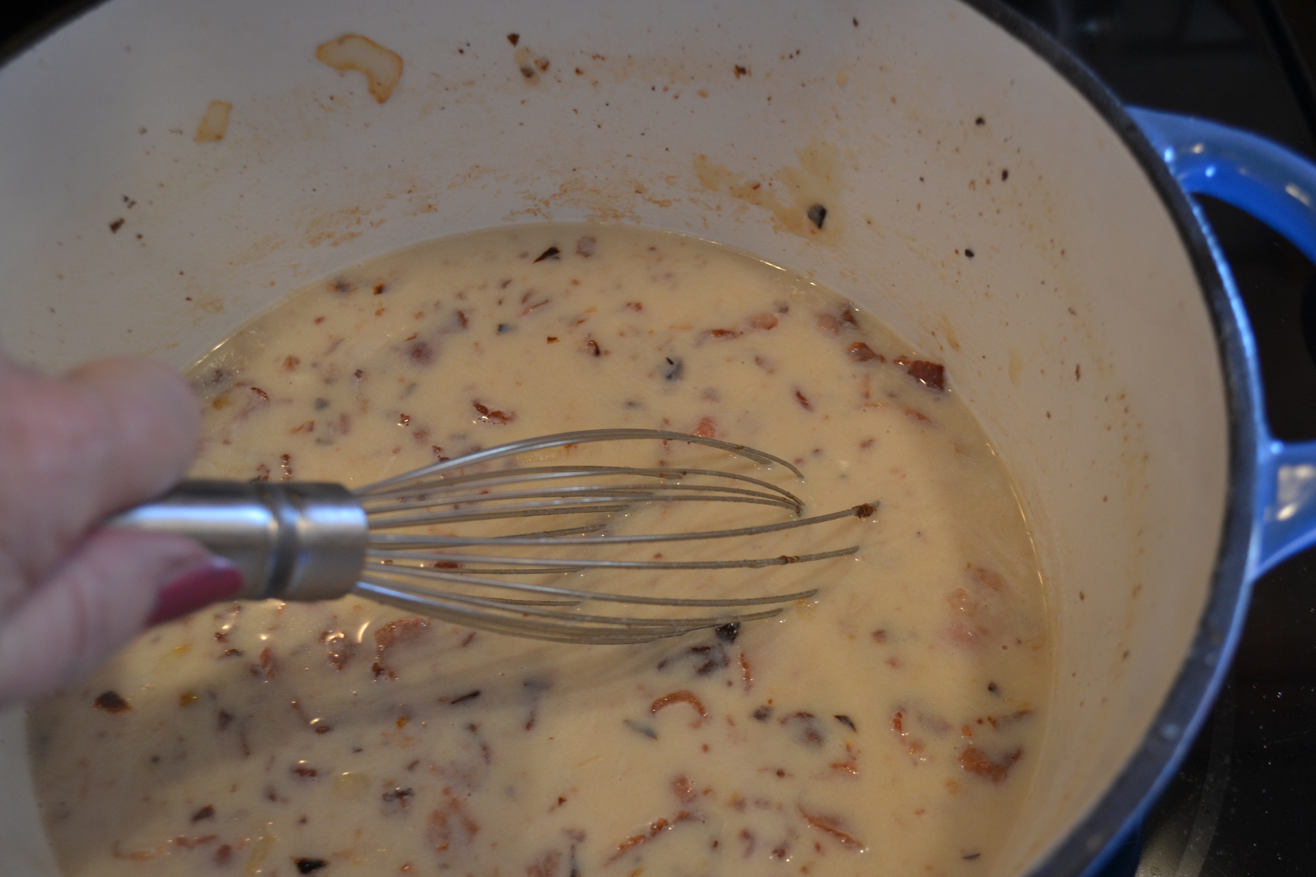 - Over medium heat, add ⅓ C flour over bacon and drippings...... and whisk; then slowly add milk, as if to make gravy. Bring almost to a boil, but not quite. This will cause the soup to thicken.