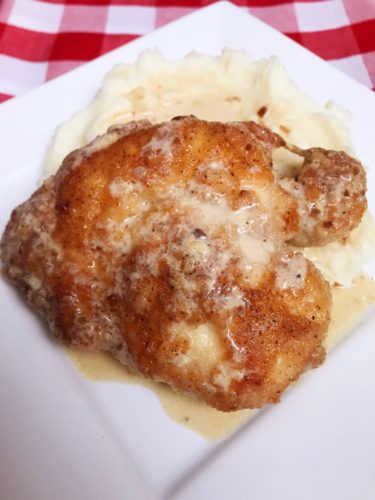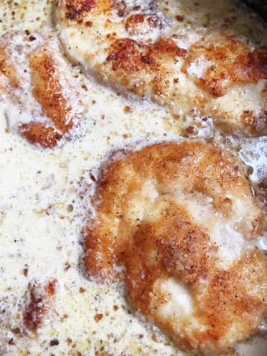 This Pan Fried Chicken in Creamy Garlic Sauce is a favorite dish in my family. If you have about 30 minutes to prepare dinner this is definitely a recipe to consider. It’s a flavorful comfort dish served over mashed potatoes (rice or pasta if so desired). Pan frying the chicken breasts makes them crispy on the outside and moist on the inside. The creamy garlic sauce with caramelized onions if flavorful but not overpowering, making it a delicious sauce.