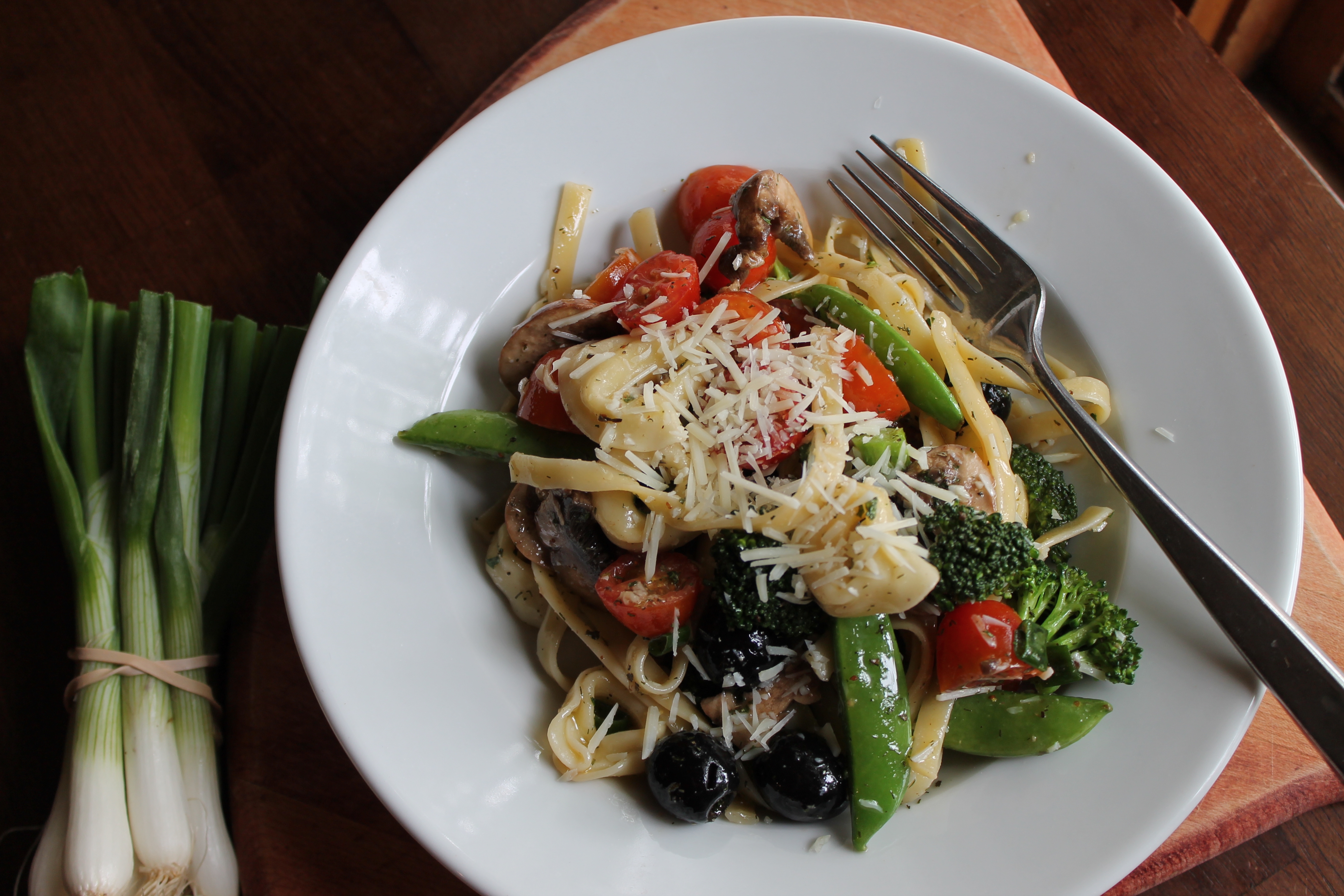 - Combine pasta with vegetables.