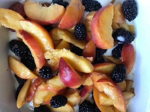 Peaches remind me of my mother-in-law. I’ll never forget having them for the first time just with a little bit of sprinkled sugar and a quick dash of almond extract as she whipped them up for one of our family vacations together. How easy and delicious! She also has made many peach pies that I can remember with either blueberries or blackberries sprinkled in, don’t they look pretty?