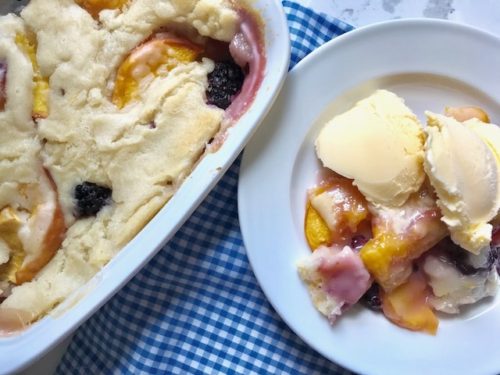 - In a medium bowl, combine peaches, blackberries, 1/4 c. sugar, lemon juice, and almond extract. Set aside. Beat together softened butter and sugar until light and fluffy. Add flour, baking powder, and salt until crumbly. Slowly pour in milk and stir until incorporated then beat until batter is smooth. Place fruit mixture at the bottom of the pan. Spread the batter evenly over the fruit. Sprinkle with remaining 1/4 c. sugar. Pour 1/4 c. water over all then place in the oven and bake for 40- 50 minutes or until golden brown.
