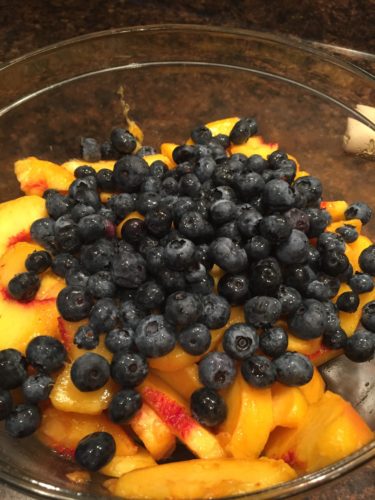 - Preheat oven to 425 degrees. In a large pot or Dutch oven, bring 2 qt. of water to a boil. Carefully lower the peaches into the boiling water and watch for skins to slip. Takes about 30-60 seconds. Quickly retrieve the peaches and place in large bowl. Slip the skins off, cut the peaches in half and discard the pit. Slice the peaches in a large bowl. Add the blueberries, flour, sugar and 1 t almonds extract. Stir all ingredients together.