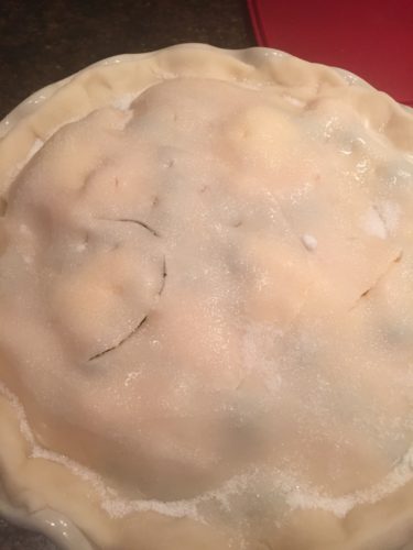 Under the top crust is about a T of butter separated into pieces. This helps the juices thicken and bit and is supposed to help from spilling over. (I’m still working on that one!)