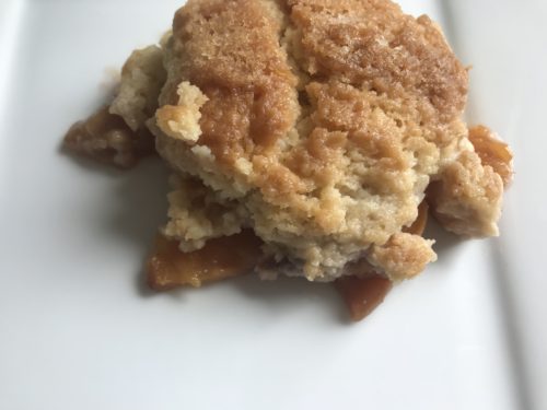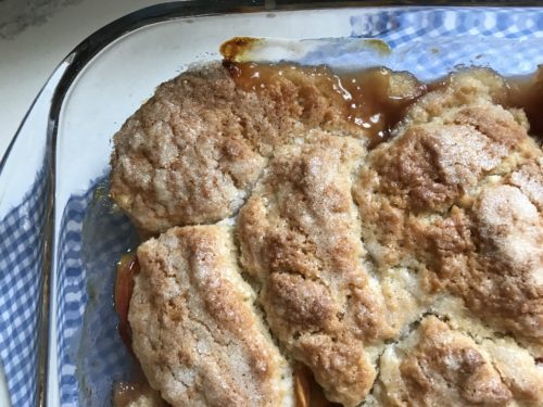 - After the peaches have baked for 10 minutes, pull from the oven and drop large spoonfuls of the dough topping over the peaches.