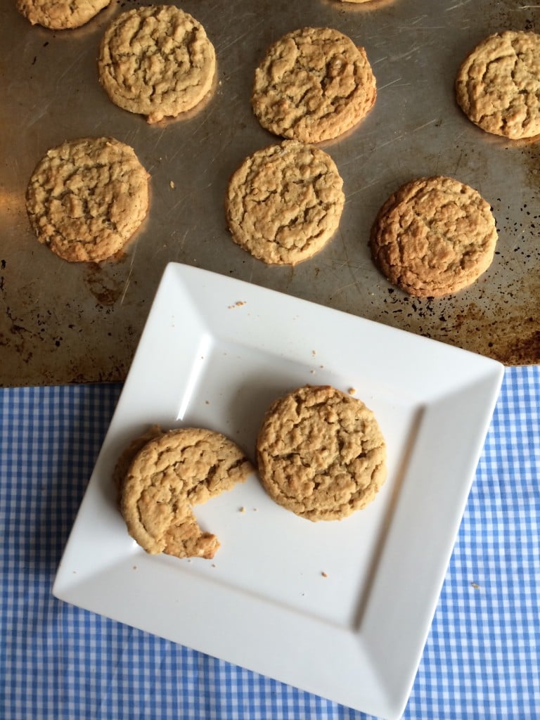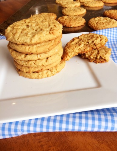 I have this adorable little one year old, who is about as small as a peanut. Ok, that might be an exaggeration, but his weight barely hits the charts. The pediatricians told me to “fatten” him up and come back in six weeks. Easy task, right?…not so much. Remember a previous post where I mentioned he eats boxed macaroni and cheese and pouch applesauce almost exclusively? (With the exception of sweets.) Therefore, the other day I tried to get creative with a sweet that would provide some protein and fiber, but also be tasty enough for his picky palate. Ta dah, insert Peanut Butter Oatmeal Cookies. The little guy will eat cookies and peanut butter, add them together with some oatmeal (for added soluble fiber), we have a winner!
