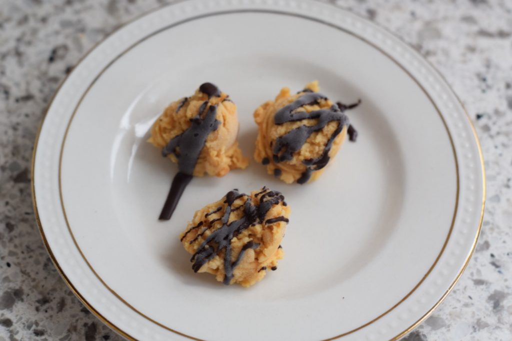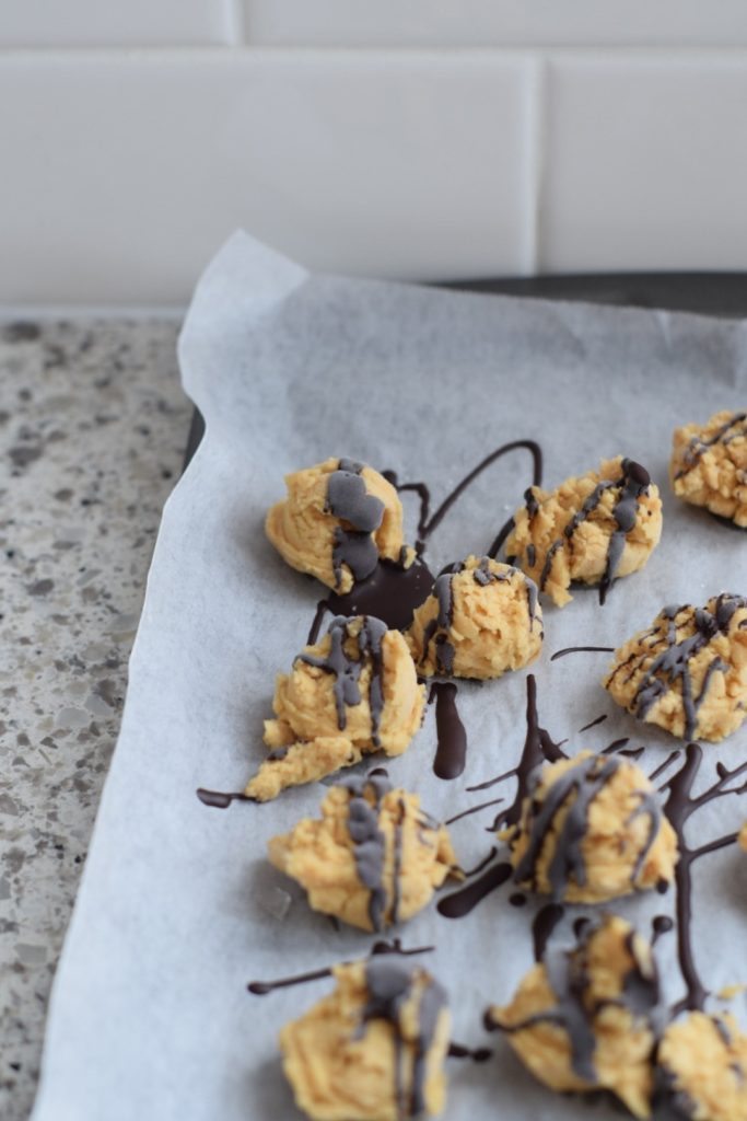 - Drop tablespoons of the peanut butter mixture onto the prepared pan. I like to use a melon baller or cookie scoop for this.