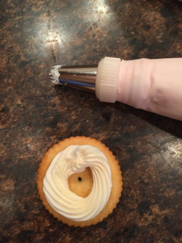 Crackers. I always choose Ritz. I believe they are what the majority of peeps prefer. Anyway, you choose your crackers, too. 🙂