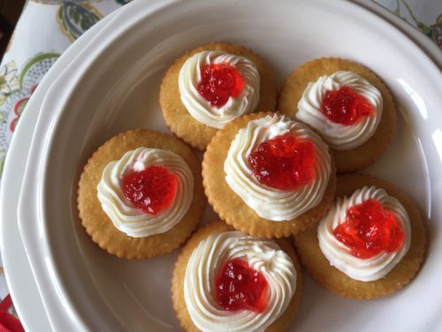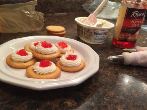 Fill one with the softened cream cheese; the other with the jelly. Find the tips you prefer and make a beautiful and quick little appetizer. No one in our family of 20 has turned one down yet. 🙂