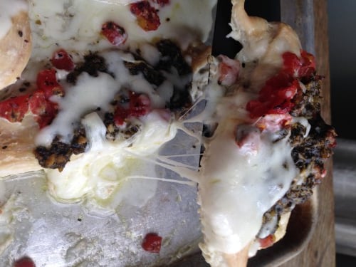 - Sprinkle mozzarella on top of chicken and return to oven for about 5 minutes or until mozzerella is melted.