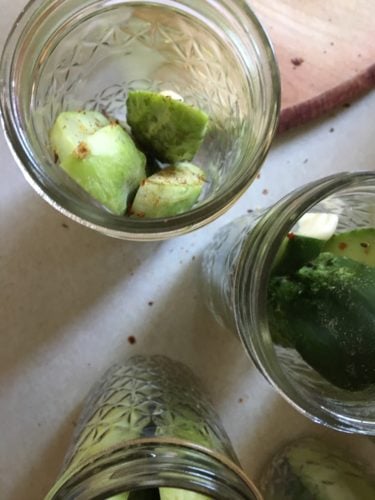- Cut cucumber pickles and evenly disperse in pint canning jars.