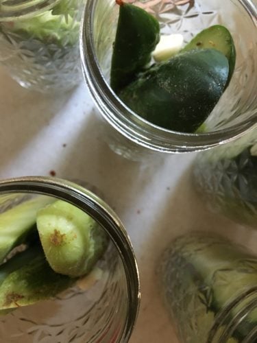 Sometimes, I think canning can sound so intimidating…but it’s actually quite easy for these pickled pickles. I either slice the cucumbers or cut them into spears (depending on size and how well they fit into the jars). Once I cut them and place in jars then I place 2 black peppercorns in each jar, a sprinkle of crushed pepper, dill seed, alum, 1/2 of a garlic clove and then fill the jar with the salt water vinegar solution – almost to the brim. Then cook with a rolling boil, hot water bath for about 10 minutes.