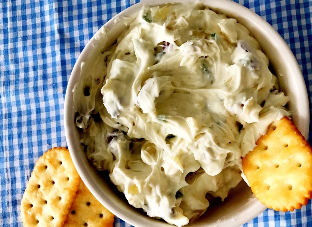 The recipe is easy to throw together and the combination of ingredients and flavor are scrumptious. Cream cheese mixed with onion, green pepper, seasoning and pineapple…I know, it sounds odd but it’s a perfect combination. Mix, chill and spread on your favorite cracker and enjoy!