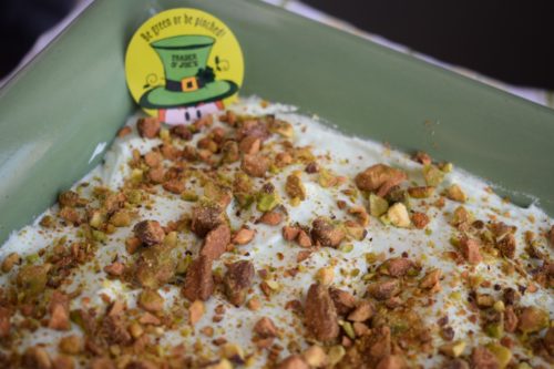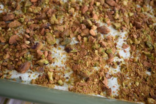 - Frost cake with frosting. Sprinkle pistachios over the top. Refrigerate until serving.