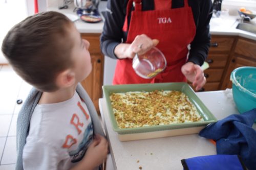 Thought I’d try out some new green recipes for this month. I snagged one the family seemed to like. The kiddos helped with the topping. Kids love to help in the kitchen. Please let them!