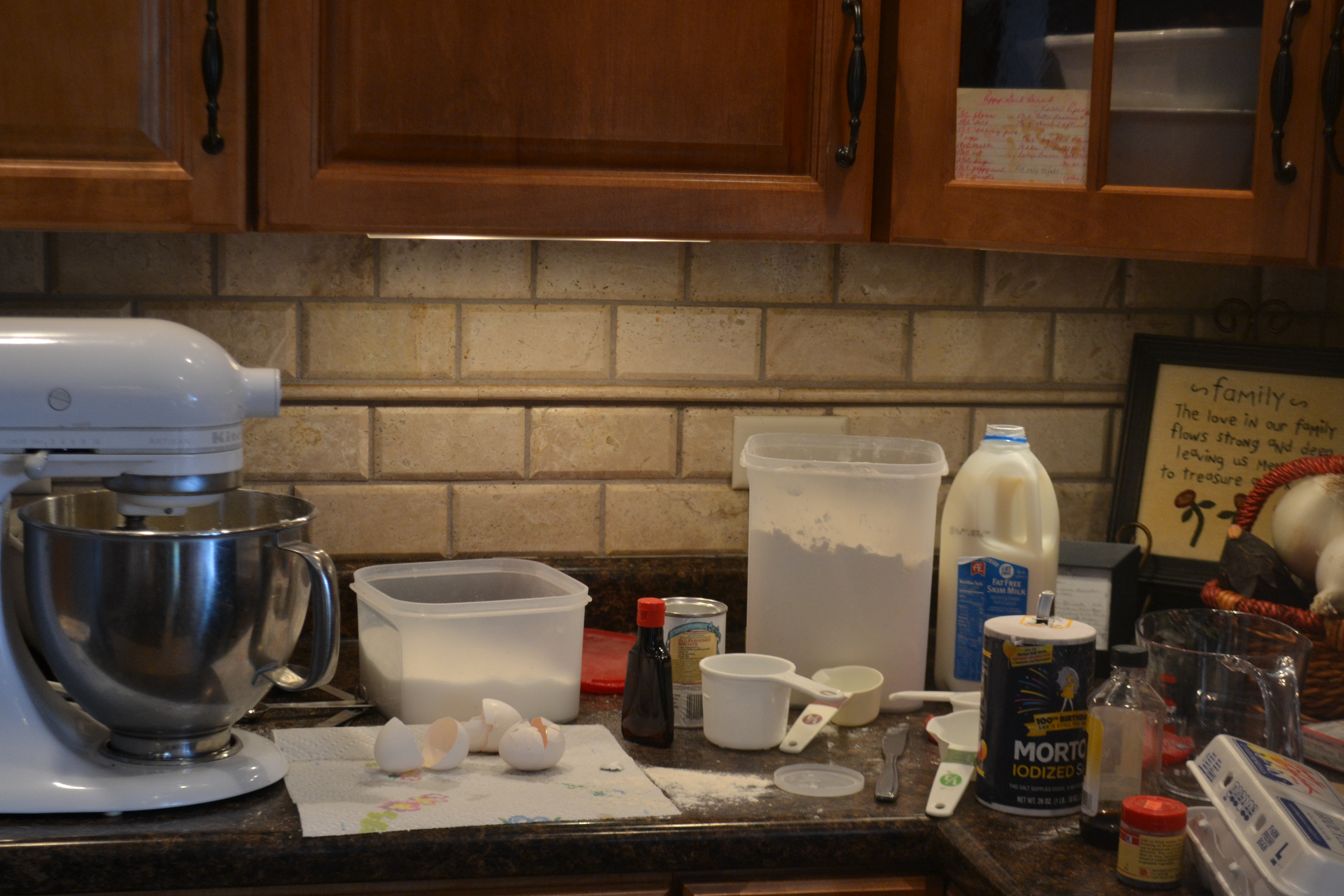 Love making a mess in the kitchen. It makes the family pretty happy as they know something good will be on the table before long. Tip: notice the paper towel by the mixer? I always start with my handy dandy paper towel. It catches the egg drips, wrappers and anything else needed to throw away. Makes clean-up a snap! This recipe is a snap, too…….one of those “dump” ones……………..you’ll see. 🙂