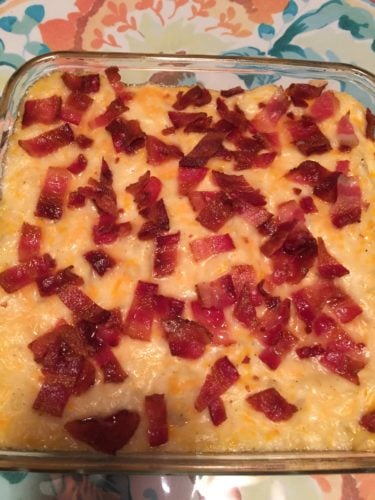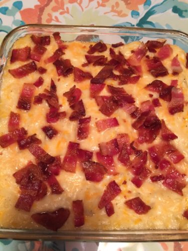 - Spoon mixture into baking dish. Sprinkle bacon and remaining cup of cheese atop, then heat through about 20 minutes.