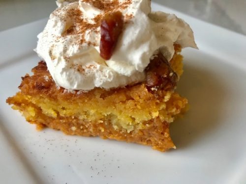 - Preheat oven to 350 degrees. Grease a 9 x 13 pan. Combine pumpkin, evaporated milk, eggs, sugar, cinnamon, and salt in large bowl. Pour into 9x13 inch pan. Sprinkle the dry cake mix evenly over the pumpkin mixture. Top with pecans. Lastly, drizzle melted butter over pecans. Bake for 50-60 minutes or until golden brown. Let cool, then top with whipping cream or whipped topping