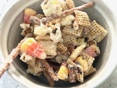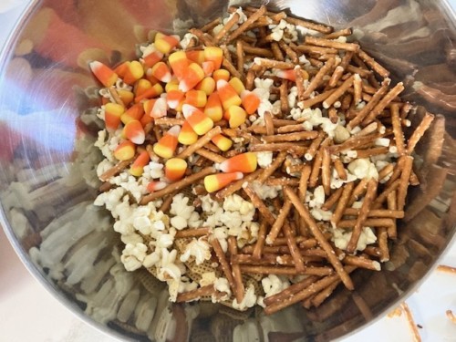 - Add the popcorn, Chex cereal, pretzel pieces, and candy corn to a very large mixing bowl.