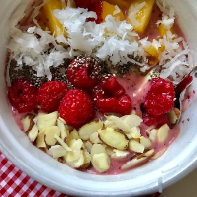 - Toppings: coconut, granola, fresh fruit, chia seeds, almonds, pecans. Drizzle with honey
