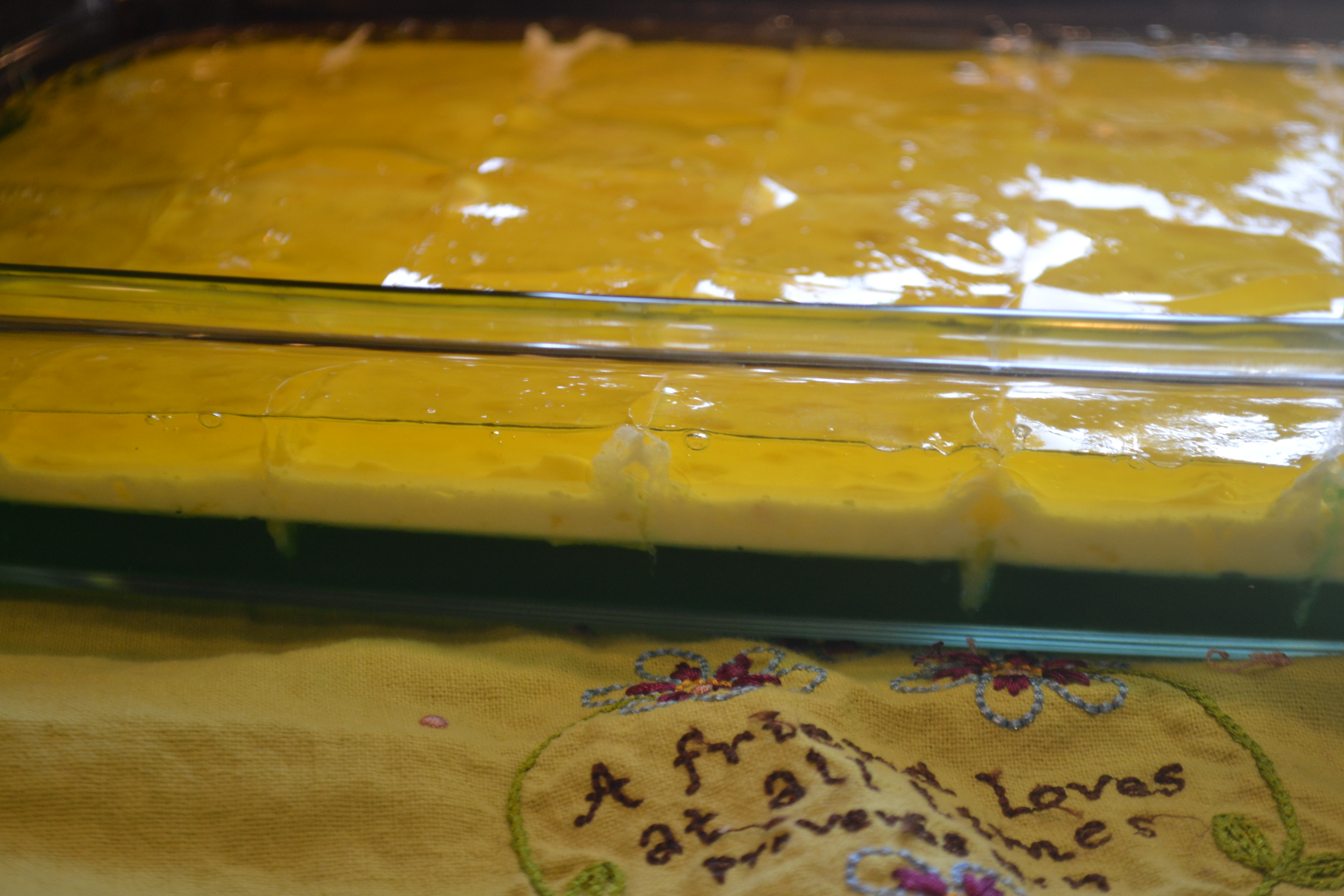 - layer one: dissolve jello in water and pour into 9x13" pan. Refrigerate until set.