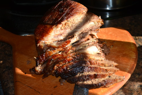 Steps: Took off wrapper; stuck it in a dutch oven; salted, peppered, a little sliced onion (atop) and poured 1/2″ water in the pot. Stuck it in the oven at 350 degrees for an hour, turned dial down to 320″ for another hour and 1/2. That’s it!
