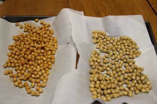 - Bake in oven at 400 degrees for 20 minutes. Remove pan and give it a good shake to toss the chickpeas.
