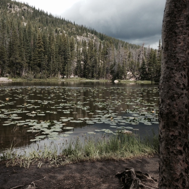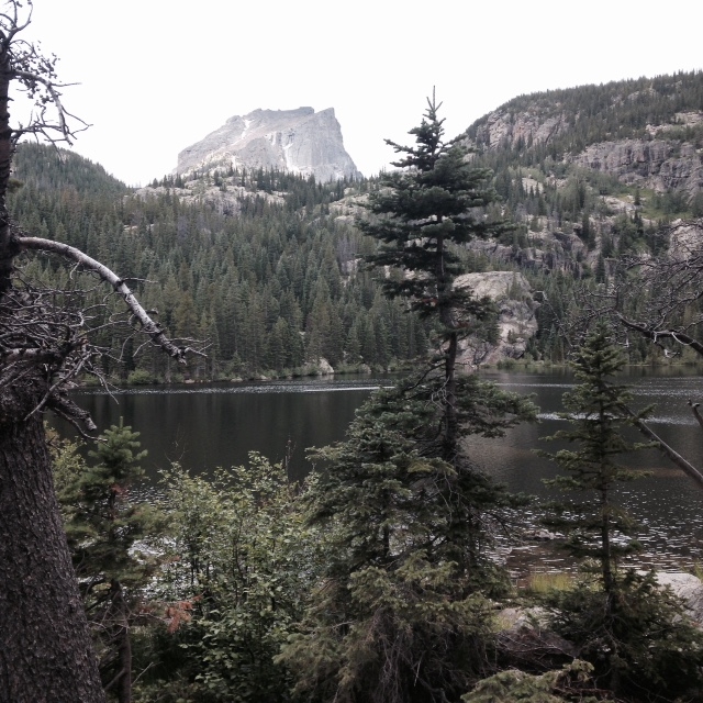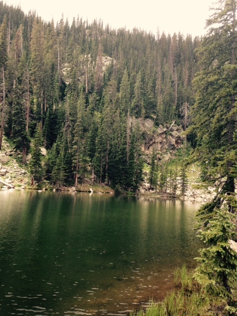 We set forth by car winding through the steep park road. I had to move my center of gravity toward the middle of the vehicle to escape vertigo at times. I later learned that the tall skinny wood sticks along the sides, were not a means for safety, but rather determining the edge of the road in the winter months. Aha! As we were nearing the peak, we were about 12,000 miles above sea level – over 2 miles! There was still a skiff of snow on some of the mountain tops. The temperature had dropped almost twenty degrees from the foot of the mountain. The weather changes quickly, and thunderstorms are common – however they don’t last long. By the time we had reached the end of the trail, we found the charming town, Grand Lake and it’s body of water a beautiful surprise! It is ringed by mountains and evergreens with a glassy blue water basin. We stayed and enjoyed an afternoon picnic by the water.