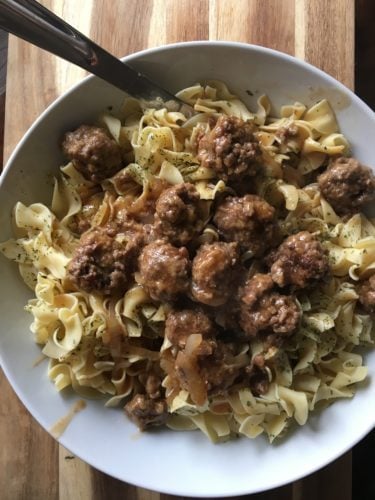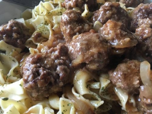 Salisbury Steak Meatballs was in order at our home the other day. Often times on Sundays we “farmers” have what I call “comfort food” – which usually involves meat and potatoes in some fashion. What is it about comfort food this time of year that hits the spot? This recipe is easy and perfect for a beef and noodles kind of a day! It makes a bunch, so invite family and friends to join, too.