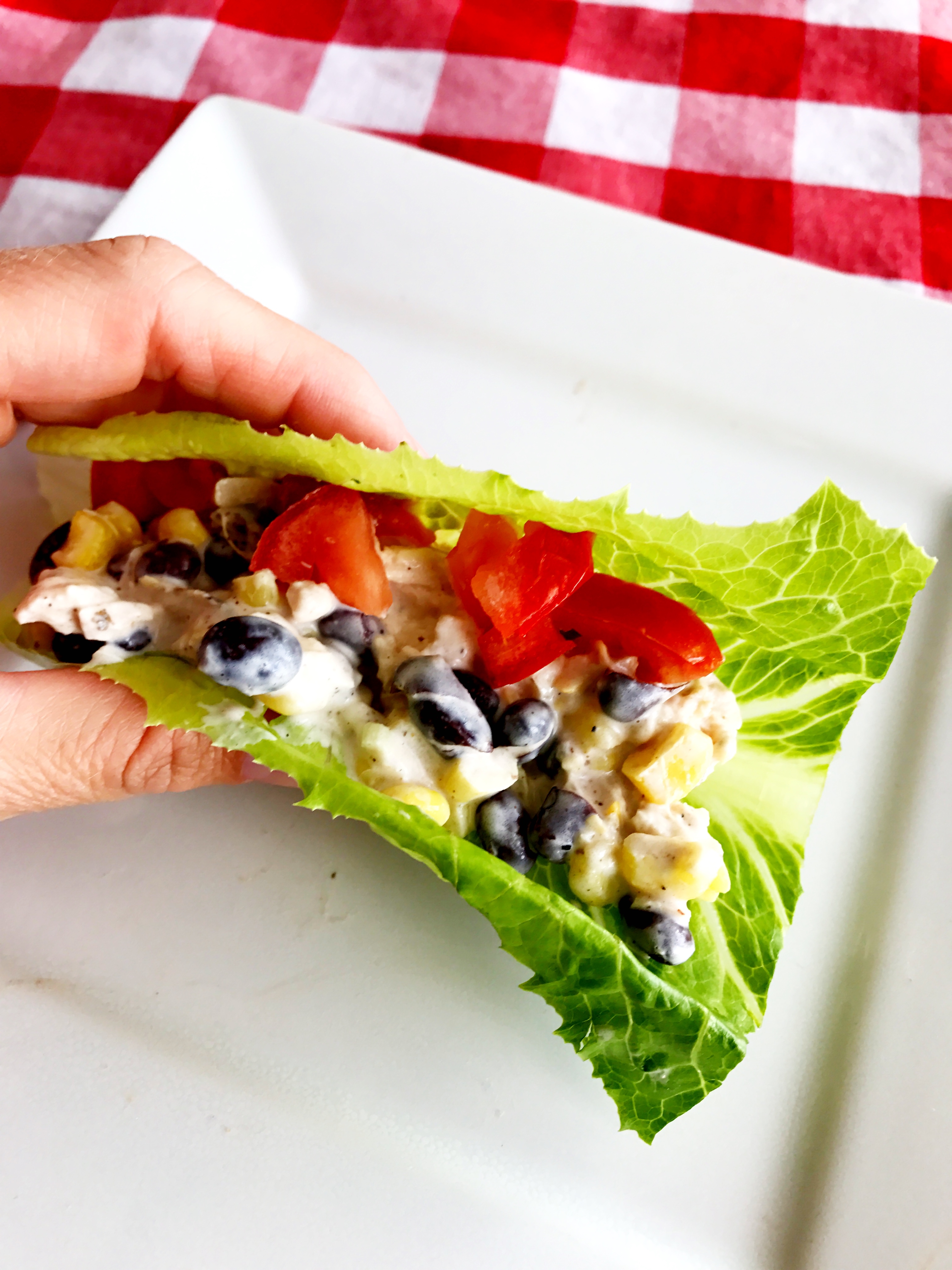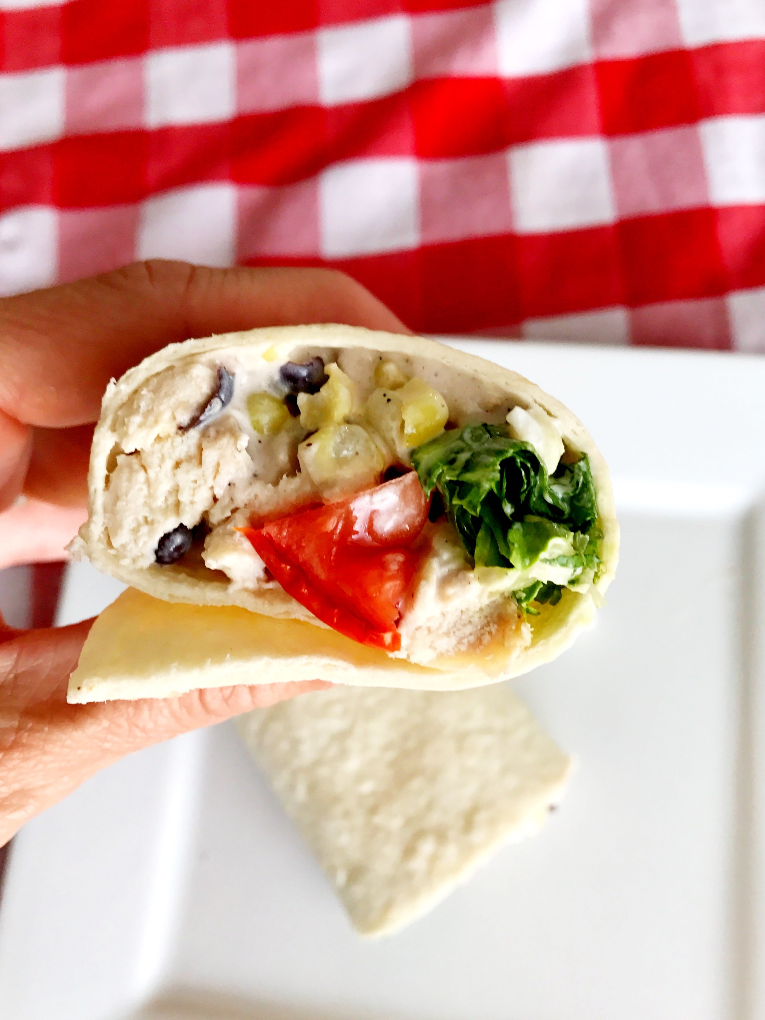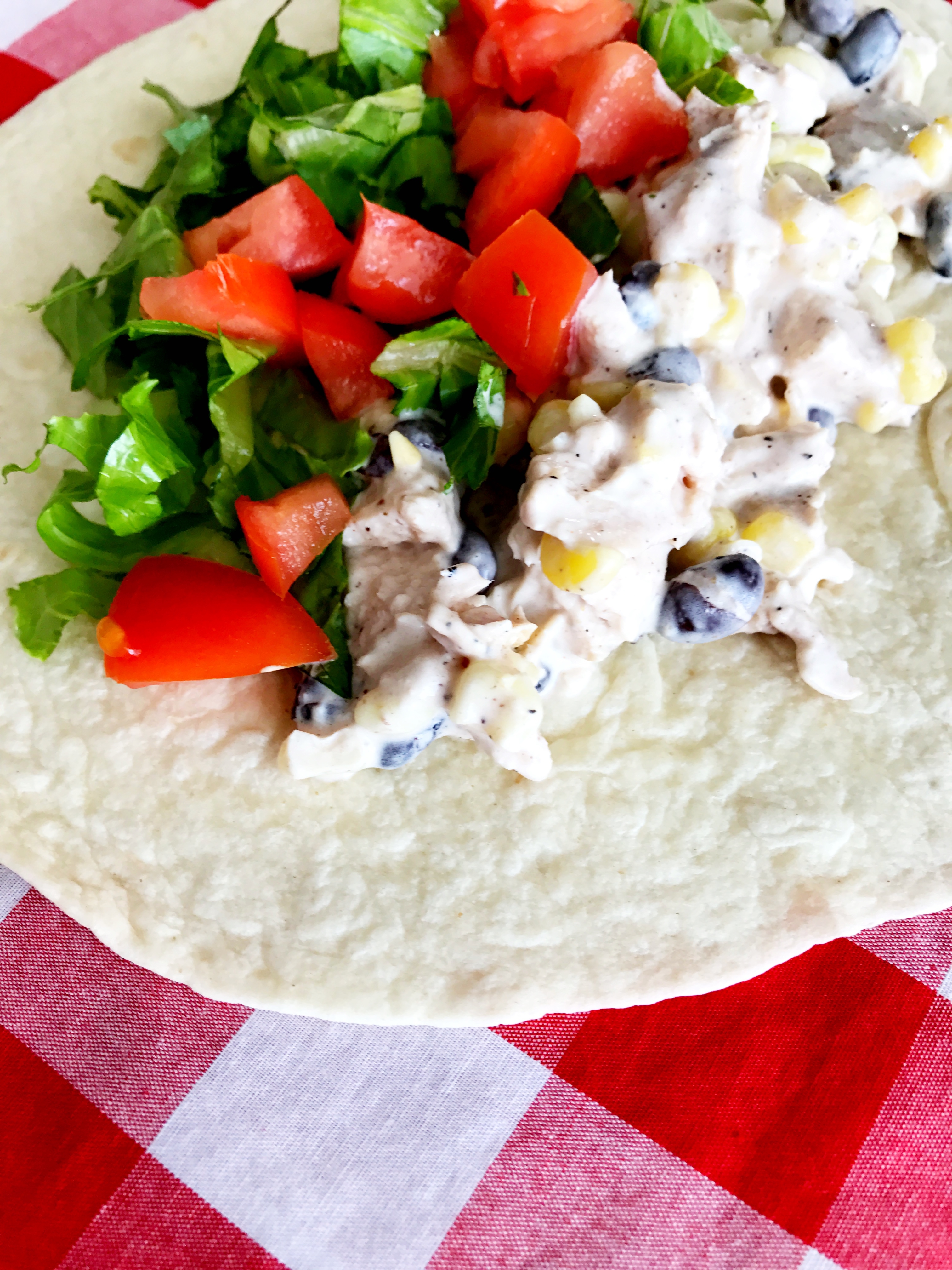 - In a large bowl, combine chicken, corn and black beans. Pour dressing over top and mix well until well combined. (store in fridge until ready to use or place right into tortillas)